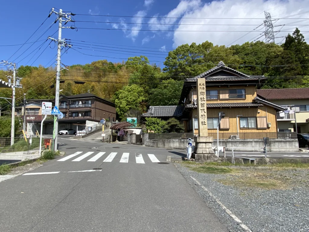 踏切を過ぎて、右に向かうと神社への階段へ、 左方向は駐車場、坂道を使って神社へと行けます。
