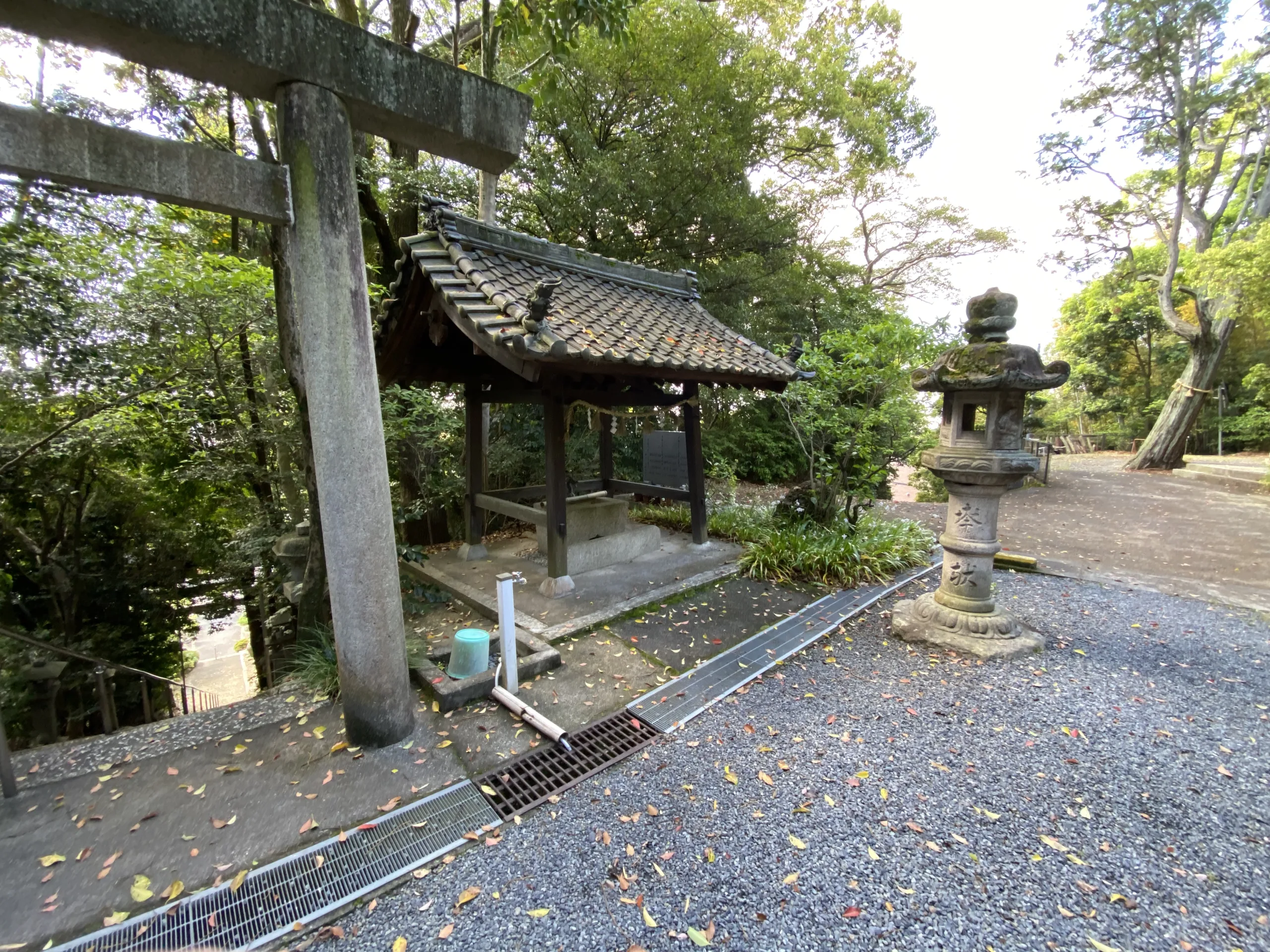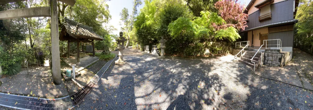 石段を登りきると社務所の広場にでます。 広場のパノラマ写真です。